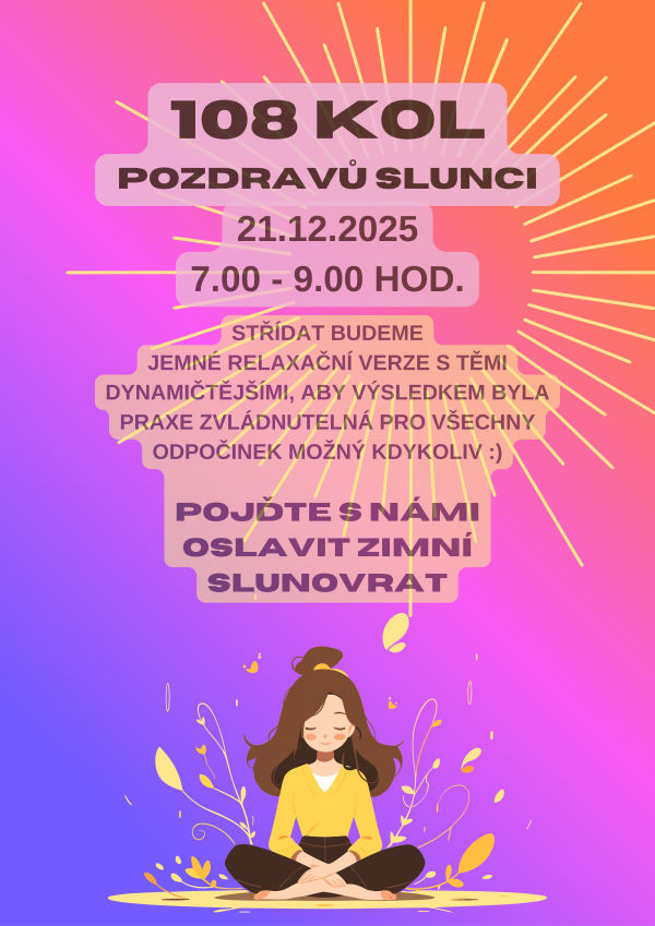 Proč 108 kol pozdravů slunci? Jako oslava ZIMNÍHO SLUNOVRATU, tedy okamžiku, kdy se k nám Slunce začíná opět vracet ve své síle. Jako zdroj života, energie a také dobré nálady.